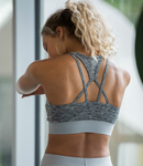 Wickability and quick drying properties. Scoop neckline. Double layer front for extra support. Cross strap detail at the back. Printable elasticated band.